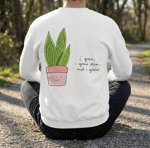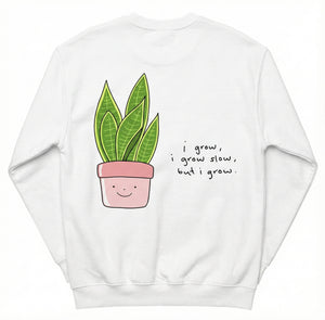Design: Cute potted snake plant with the quote "i grow, i grow slow, but i grow" printed on the back.